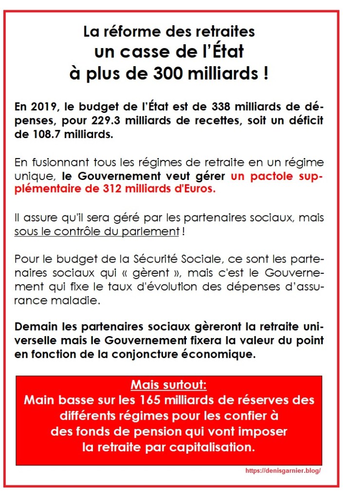 Il dit que ce fond de la retraite universelle sera géré par les partenaires sociaux, mais, car il y a un mais, sous le contrôle du parlement. C’est-à-dire, comme la Sécurité Sociale ! C’est le Gouvernement qui fixe le taux d’évolution des dépenses de santé ! Ainsi il va mettre la main sur toutes les cotisations retraite qui sont actuellement versées par les entreprises et les salariés.
