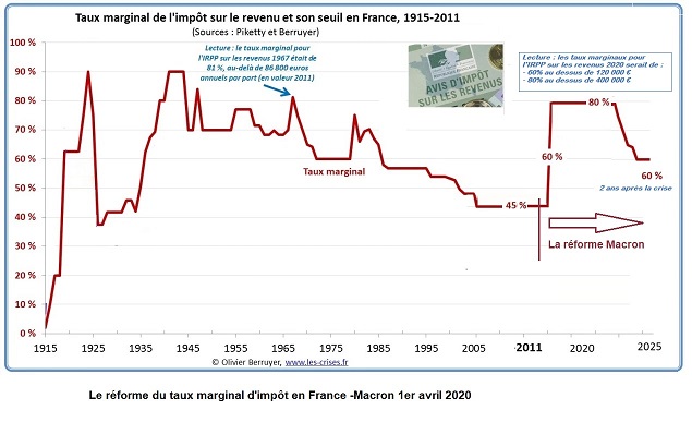 Ainsi en récupérant 3,5 milliards en impôt sur la fortune, en intégrant les revenus du capital dans les revenus imposables et en créant deux tranches supplémentaires et exceptionnelles d’impôts, l’État devrait récupérer plus de 40 milliards d’euros par an !. La première tranche exceptionnelle porterait l’impôt à 60% au delà de 120 000€ et la seconde à 80% au delà de 400 000 euros. Ces mesures devraient être reconduite au minimum pendant deux ans, voire plus selon la conjoncture économique. (tableau ci-dessous qui montre par exemple qu’en 1967 l’impôt était de 81% au delà de 86 800 euros)