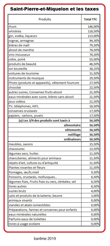 En matière de taxes les 6000 habitants de l’archipel paient en moyenne 2 681 € par an, quand les 67 millions de métropolitains n’en paient que 2 127 € (26% de plus qu’en métropole). Comme l’expose le tableau ci-dessous, entre les impôts et les taxes, les habitants de Saint-Pierre-et-Miquelon connaissent un prélèvement supérieur de 40,84% sur les impôts et taxes métropolitains.