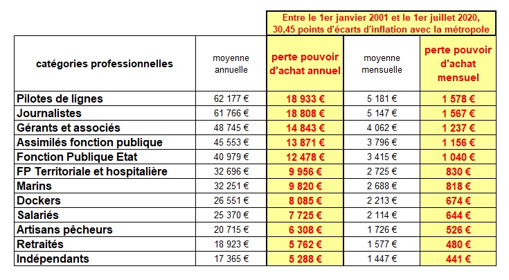 Pour représenter ce que chaque profession perd en moyenne avec cette inflation galopante dans l’archipel, j’ai réalisé ce tableau qui reprend les chiffres de l’IEDOM et qui renseigne la perte de revenus qu’entraîne cet écart d’inflation calculé entre le 1er janvier 2001 et le 30 juin 2020. Un écart de 30,45 points !