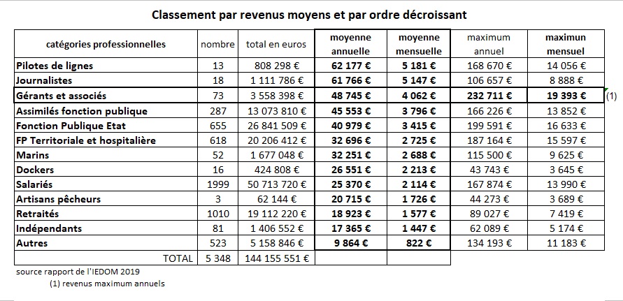Heureusement, l’IEDOM semble plus efficace, car dans son dernier rapport 2019, nous pouvons prendre connaissance des niveaux de revenus par catégories professionnelles. C’est, en effet, très intéressant. Voyez plutôt le tableau ci-dessous qu’est incapable de produire l’OMPR.