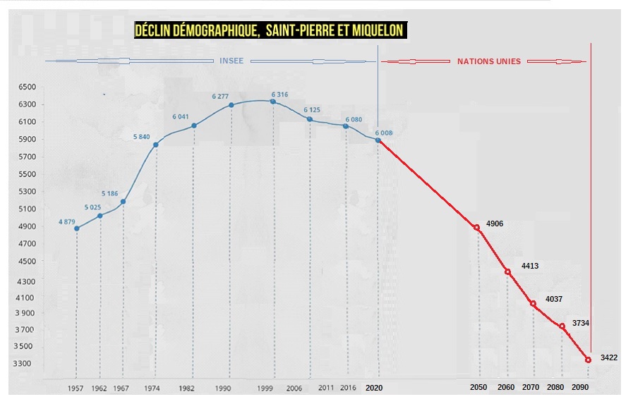 M’inspirant du graphique publié par SPM la première, qui s’appuie sur les données de l’INSEE (voir ICI), j’ai accolé les projections des démographes des Nations Unies (Voir ICI), pour obtenir une vision complète de l’évolution démographique de l’archipel.