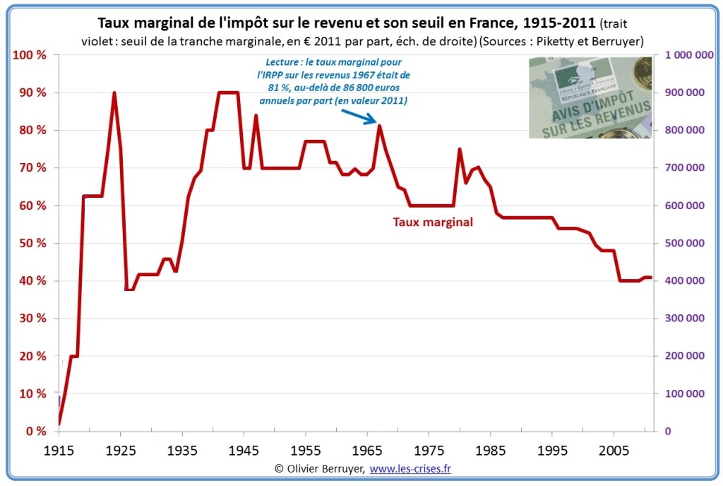 Crise de 1929, durant la guerre de 1939/1945, taux marginal de l’impôt sur les plus hauts revenus à 90 % !