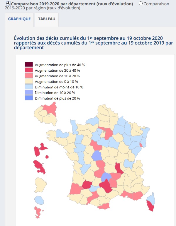 Le nombre de décès enregistré entre le 1ᵉʳ septembre et le 19 octobre 2020 est supérieur à celui mesuré sur la même période en 2018 ou 2019 dans toutes les régions de la France métropolitaine, à l’exception de deux d’entre elles (Centre-Val de Loire ; – 1 % par rapport à 2019, + 3 % par rapport à 2018) et Grand Est ;- 2 % par rapport à 2019 et 2018).