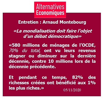 J’ai parcouru avec grand intérêt l’entretien que Arnaud Montebourg a accordé à « Alternatives économiques » le 5 novembre 2020 : « La mondialisation doit faire l’objet d’un débat démocratique ». Pour lui, la politique économique suivie, condamne les classes moyennes frappées par l’austérité salariale et l’envolée des rémunérations du capital.