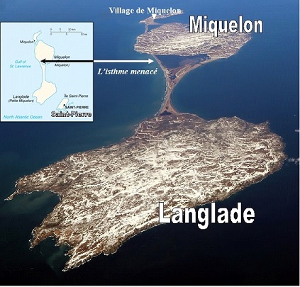 La seule liaison entre les deux iles est assurée par une route entretenue par le Conseil Territorial. Suite aux tempêtes de l’hiver, elle vient d’être coupée à l’endroit indiqué sur la photo ci-dessous. Contrairement à Miquelon, l’île de Langlade ne compte ni port, ni aéroport ! La route coupée signifie l’impossibilité de la rejoindre.