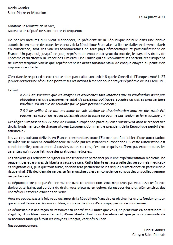 Le loup Macron impose donc la coercition et demande à ses agneaux de députés de manger les libertés. Par la lettre ci-dessous, j’invite les deux élus – Ministre, députée titulaire et le député suppléant – qui sont confinés par la présidence de la République de s’extraire de cette tutelle mortifère pour la démocratie. Un vaccin, peut-il faire sauter ce qui fait l’essence de notre démocratie ?