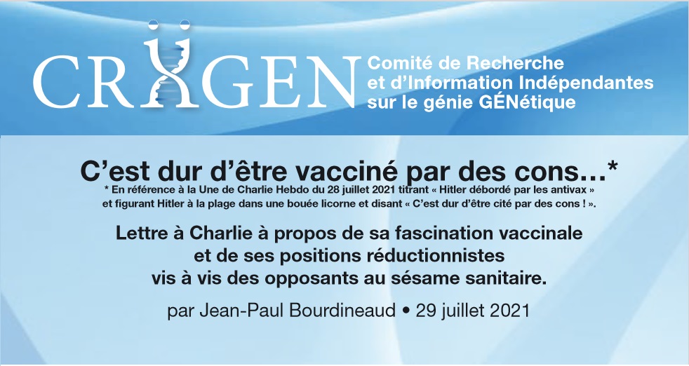 « Par réciprocité, il serait de bon aloi que les médecins apparaissant dans les médias voulussent bien révéler leurs conflits d’intérêt, et surtout que les journalistes osassent leur poser la question. Quant à moi, et depuis que je suis universitaire, je n’ai jamais reçu de gratifications, prébendes, émoluments ou primes d’un quelconque industriel ou organisme privé ; mon association au CRIIGEN est du pur bénévolat. Et non, nous ne sommes pas anti-vaccinalistes : écoutez par exemple mon ami Christian Vélot, président du conseil scientifique du CRIIGEN et maître de conférences en génétique à l’Université de Paris-Sud, lors de son entretien sur France Soir ou sa conférence censurée par Youtube. (De nouveau accessible ICI) Nous sommes explicites quant à notre volonté de voir advenir un véritable vaccin, efficace, sûr et protégeant sur la durée. » (Jean-Paul Bourdineaud • 29 juillet 2021)