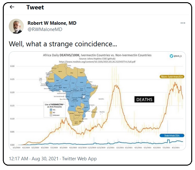 « Et pourquoi l’ivermectine est-elle si négativement ciblée par les Big Tech et les Big Media ? On peut penser que les conflits d’intérêts jouent un rôle majeur, au vu des liens étroits qui les lient à Big Pharma et de l’influence à longue portée la Fondation Bill et Melinda Gates. Un traitement précoce, bon marché et efficace contre la Covid-19, tel que l’ivermectine, peut être considéré comme une grave menace pour les intérêts financiers liés aux vaccins anti-Covid et aux médicaments antiviraux chers.
