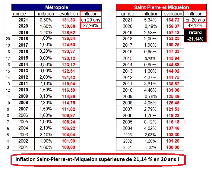 Sur 20 ans, SPM a connu une hausse des prix de +49,12 % contre +27,98 % en métropole. La différence dépasse les 20 % ! Exactement 21,14 % depuis 2001 !