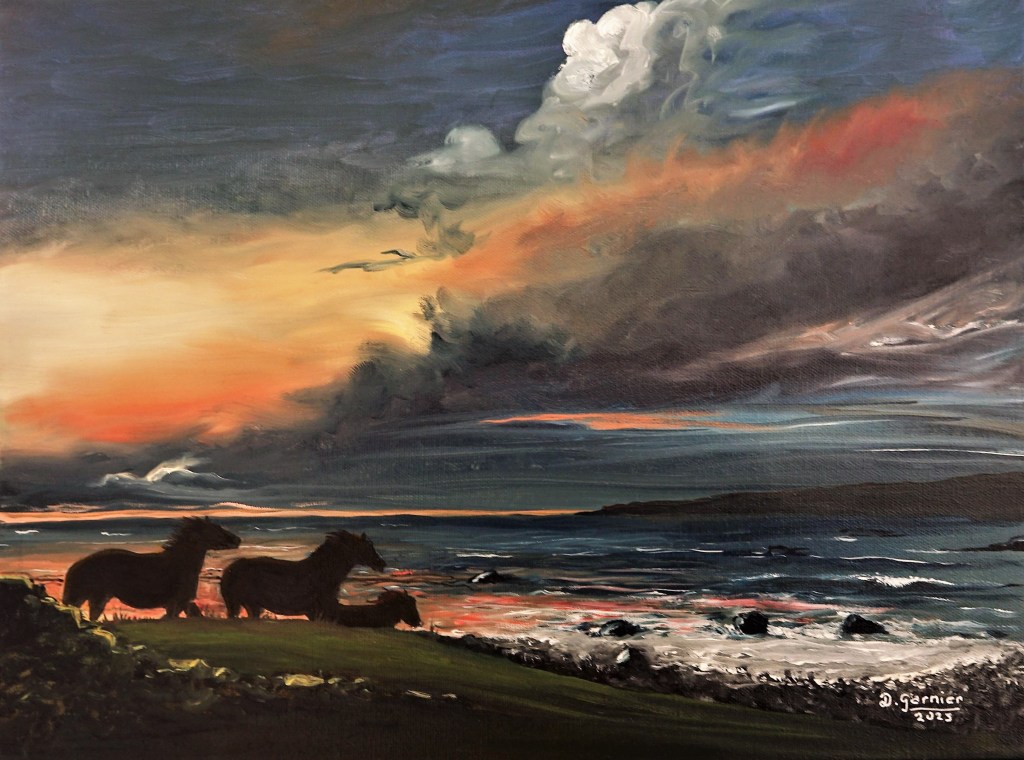 Dans le même temps, entre deux couches du « lac d’automne », avec le reste de peinture de la palette, je lance les pinceaux à l’assaut d’un ciel d’orage. De la palette à la toile, les pinceaux se libèrent. Vinrent ensuite la plage et les chevaux au vent…