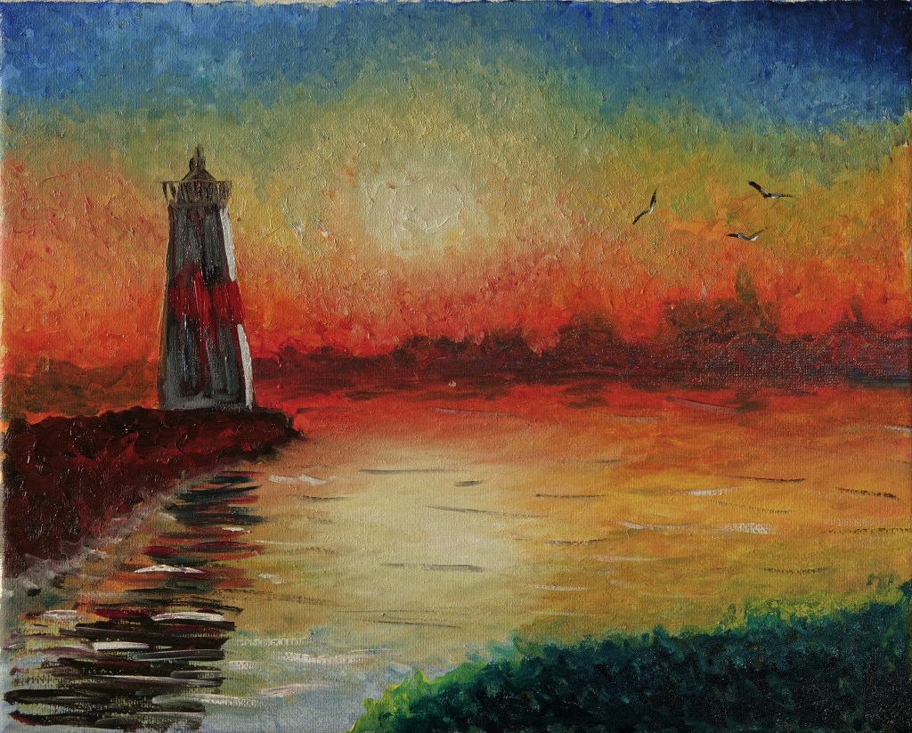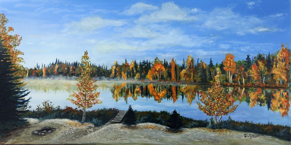 La 10ᵉ peinture à l’huile répond à une commande surprise pour l’anniversaire d’un ami. Le dessin, les formes, les couleurs d’automne sur un lac québécois m’ont demandé une quinzaine de jours de touches et de retouches. Le travail sur les couleurs fut important, d’autant qu’un ami m’a donné quelques tubes que je n’avais pas, dont « l’orange de Chine » et le vert « Terre verte ». De la peinture extra-fine qui m’a permis de sublimer quelques points.