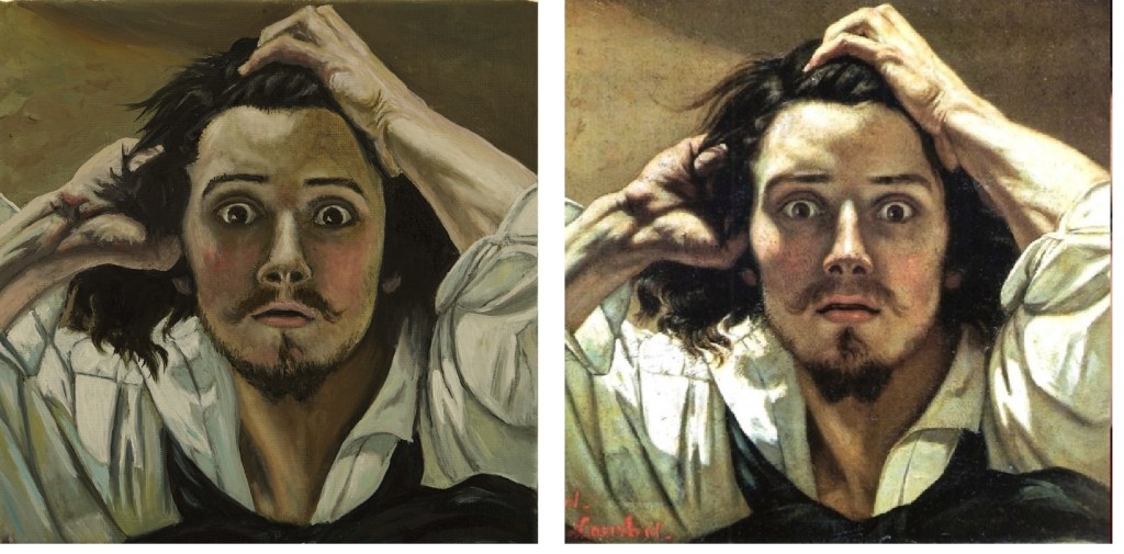 Pour parfaire encore la technique, je décide d’entreprendre un portrait sur un petit format de 20 cm sur 20 cm. Pour gagner du temps, j’utilise la technique du calque pour reproduire les formes. Le modèle ? Un autoportrait du célèbre peintre Gustave COURBET :