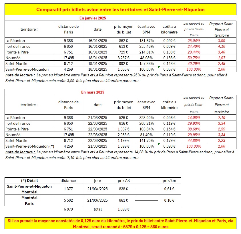 Ainsi, en appliquant ce coût moyen, le prix du billet pour St-Pierre-Paris via Montréal, s’établirait à 860 € ( 6879 km x 0,125 € = 860 €). En vol direct, le prix serait de 534 € ! (4269 km x 0,125 € = 534 €)