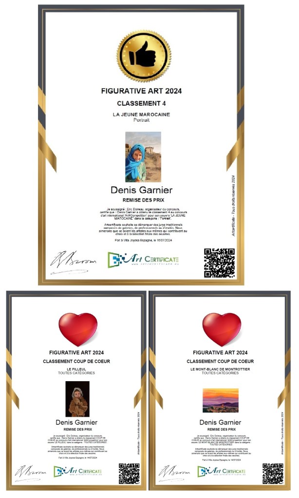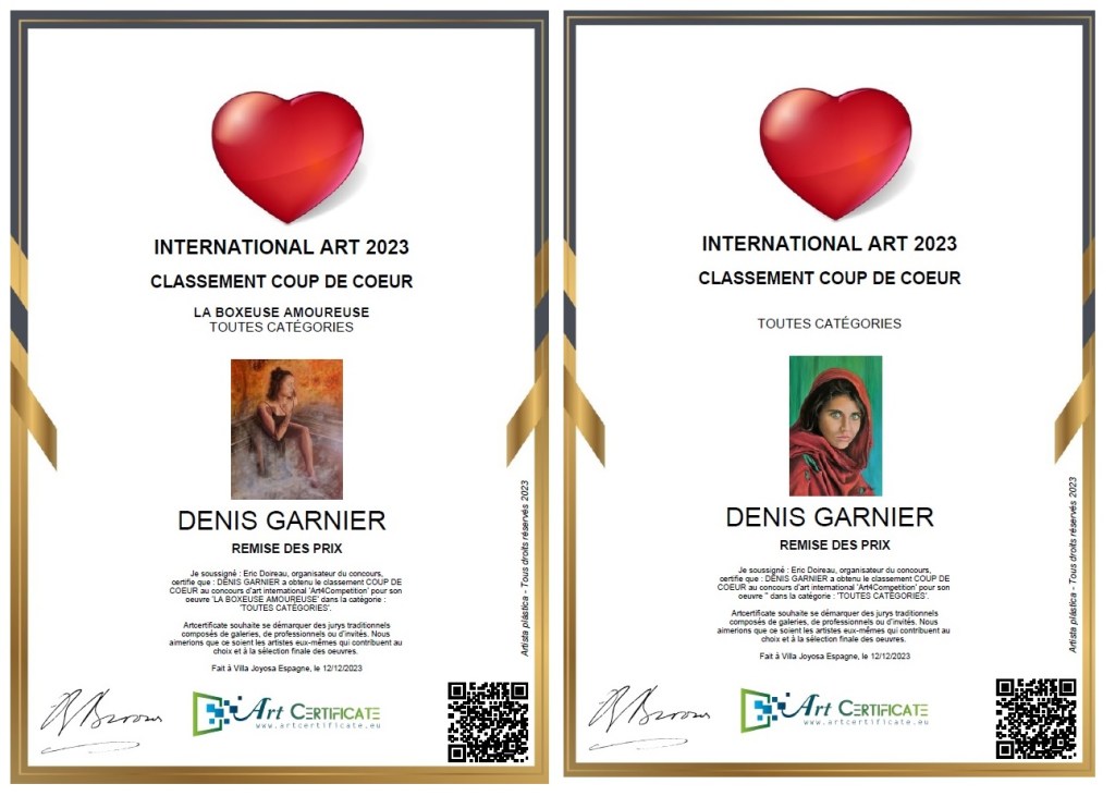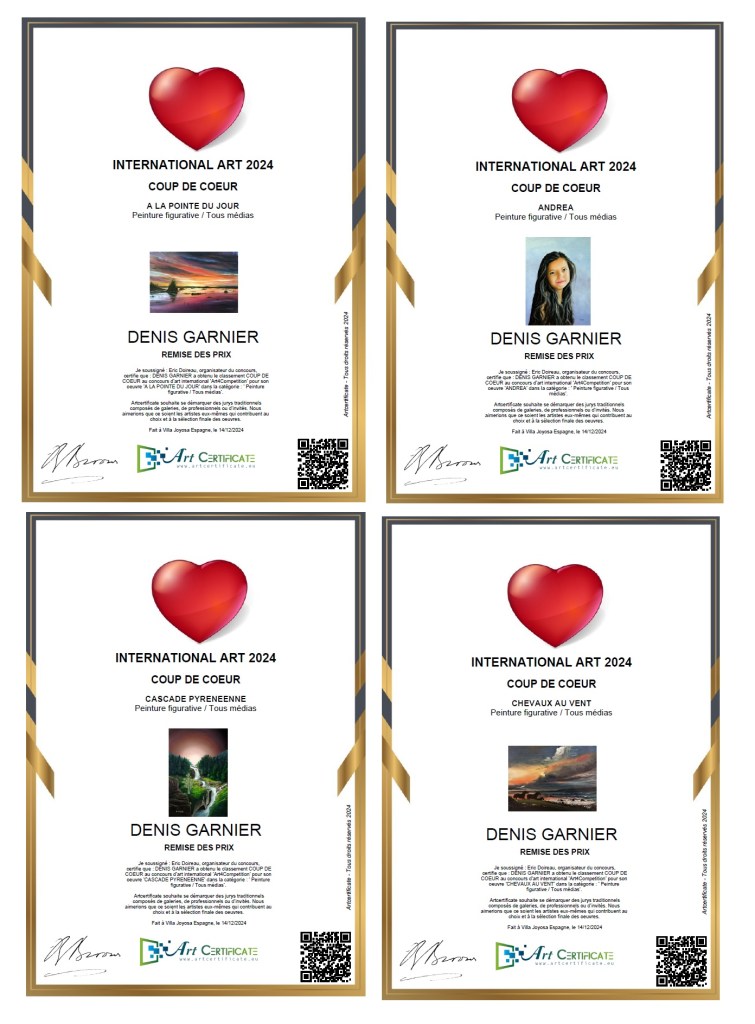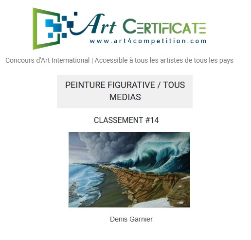 J’ai présenté des toiles dans le cadre de concours internationaux organisés par « ArtCertificate » (Espagne). Un concours ouvert aux artistes de tous les pays. « Artcertificate se démarque des jurys traditionnels composés de galeries, de professionnels ou d’invités. Nous voulons que ce soient les artistes eux-mêmes qui contribuent au choix et à la sélection finale des œuvres. Pourquoi ? Tout simplement parce que ce sont les plus qualifiés. »