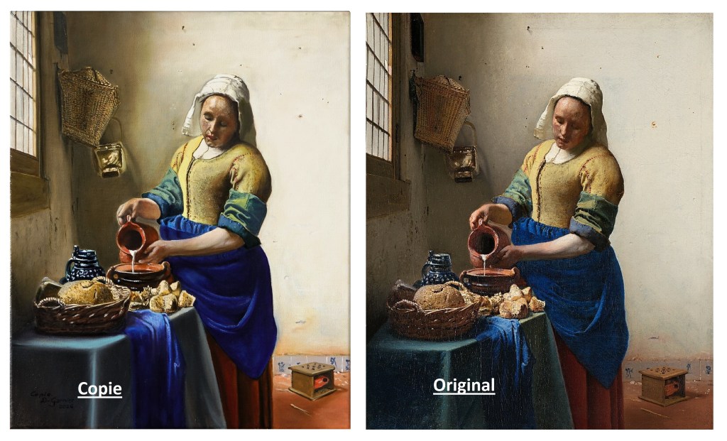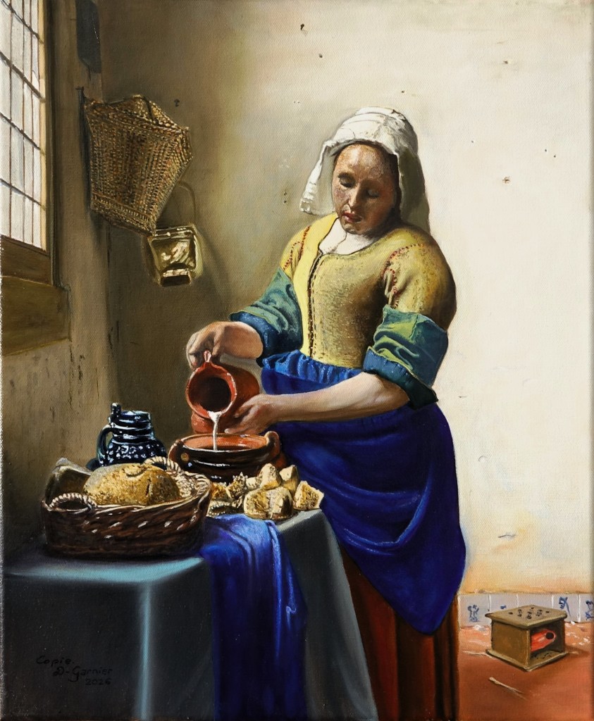 La copie de « La laitière », une célèbre toile de Johannes Vermeer. Un travail de patience, d’étude, de lecture des différentes présentations de l’œuvre pour en connaître toutes les subtilités.