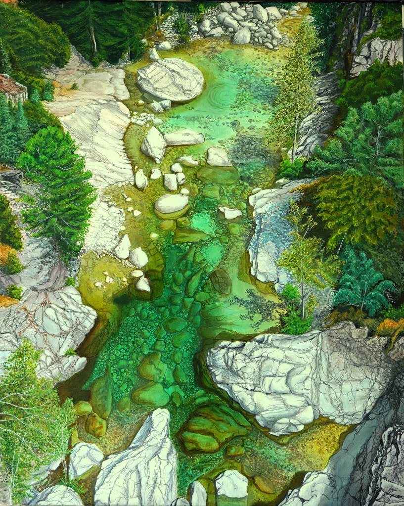 La photo originale de @Darinho_2b, m’a invité à travailler les verts et la transparence de l’eau. Du bleu, du jaune, du rouge, du violet et quelques verts en tube retravaillés avec des ocres, etc.