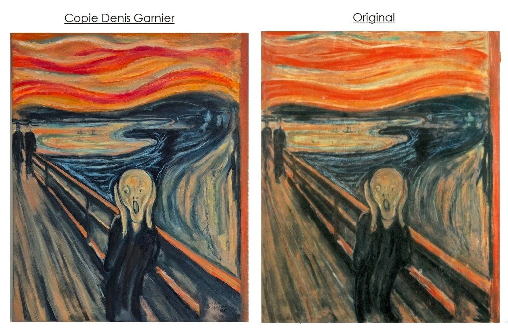 Décidément, si la copie est avant tout un travail d’élève, elle peut aussi procurer un certain plaisir. Au cours d’un échange gourmand dans un bon restaurant de Saint-Pierre, un ami, me confiait son admiration pour le tableau de Munch ; « Le cri ». Alors, pour le remercier de son invitation, je me lançais dans la reproduction de ce célèbre tableau que je ne connaissais pas.